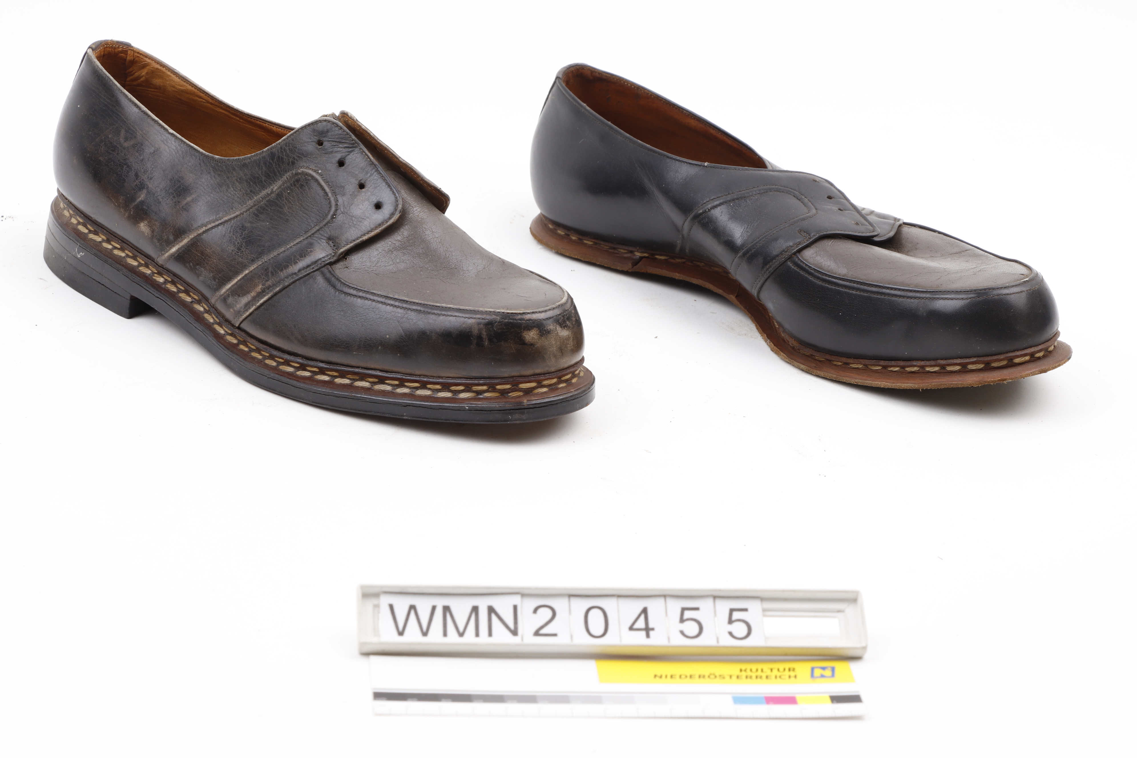 Halbschuhe; braun; knöchelhoher Schaft; Zunge zwischen 2 auf dem Vorderblatt liegende Quartier mit 8 Löcher zum Schnüren; a: 26cm x 9cm x 9cm; b: 26cm x 9,5cm x 7m