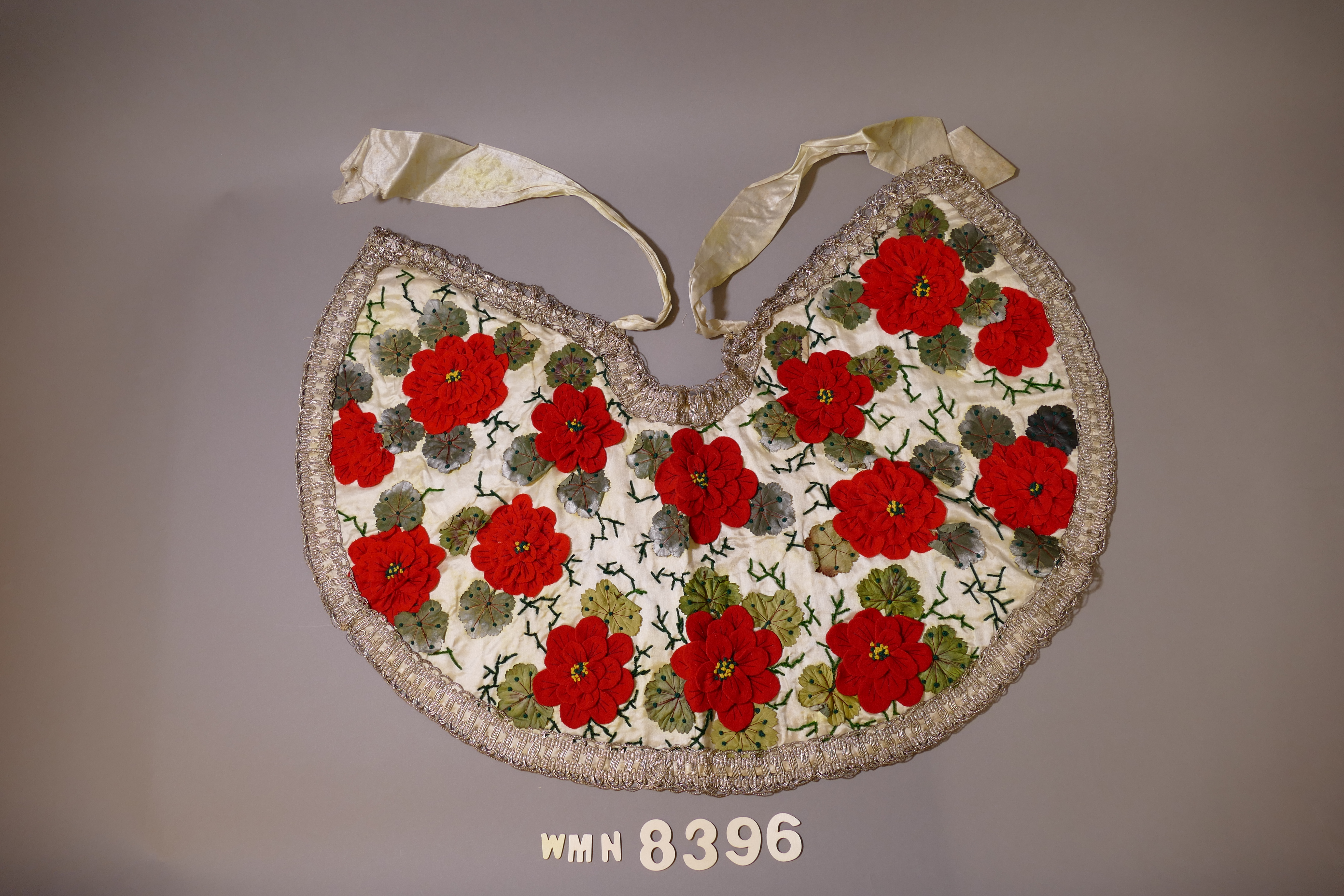 Cape; weiß; Halbkreisform mit zwei Bändern, Kragen zum Bedecken der Schultern; Rückseite mit weißer Seide gefüttert; auf der gesamten Vorderseite appliziertes florales Motiv und Blattwerk (rote Blüten aus Filz, Astwerk aus Pfeifenputzer und Blattwerk aus Kunstfaser - rot, grün, gelb, silberfarben); entlang der Kante applizierte Borte aus Metallfäden (silberfarben); 2 weiße Bänder zum Verschließen am Halsausschnitt, 59 x 7 cm;