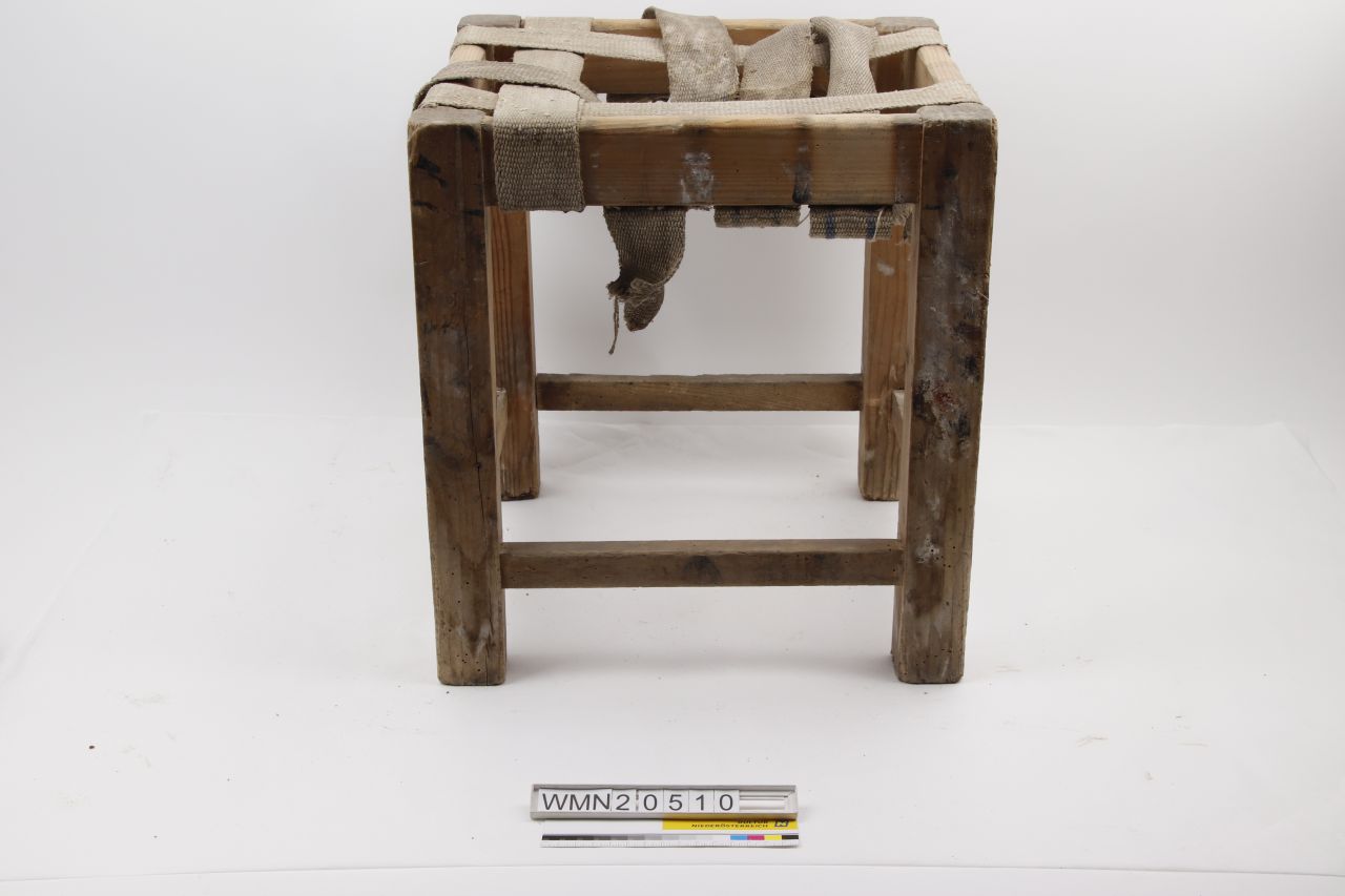 Stockerl; braun; rechteckige Sitzfläche aus Jutegurten; 4 Füße mit 4 Fußsprossen verbunden; mit Holznägeln genagelt; schwarze und weiße Farbreste