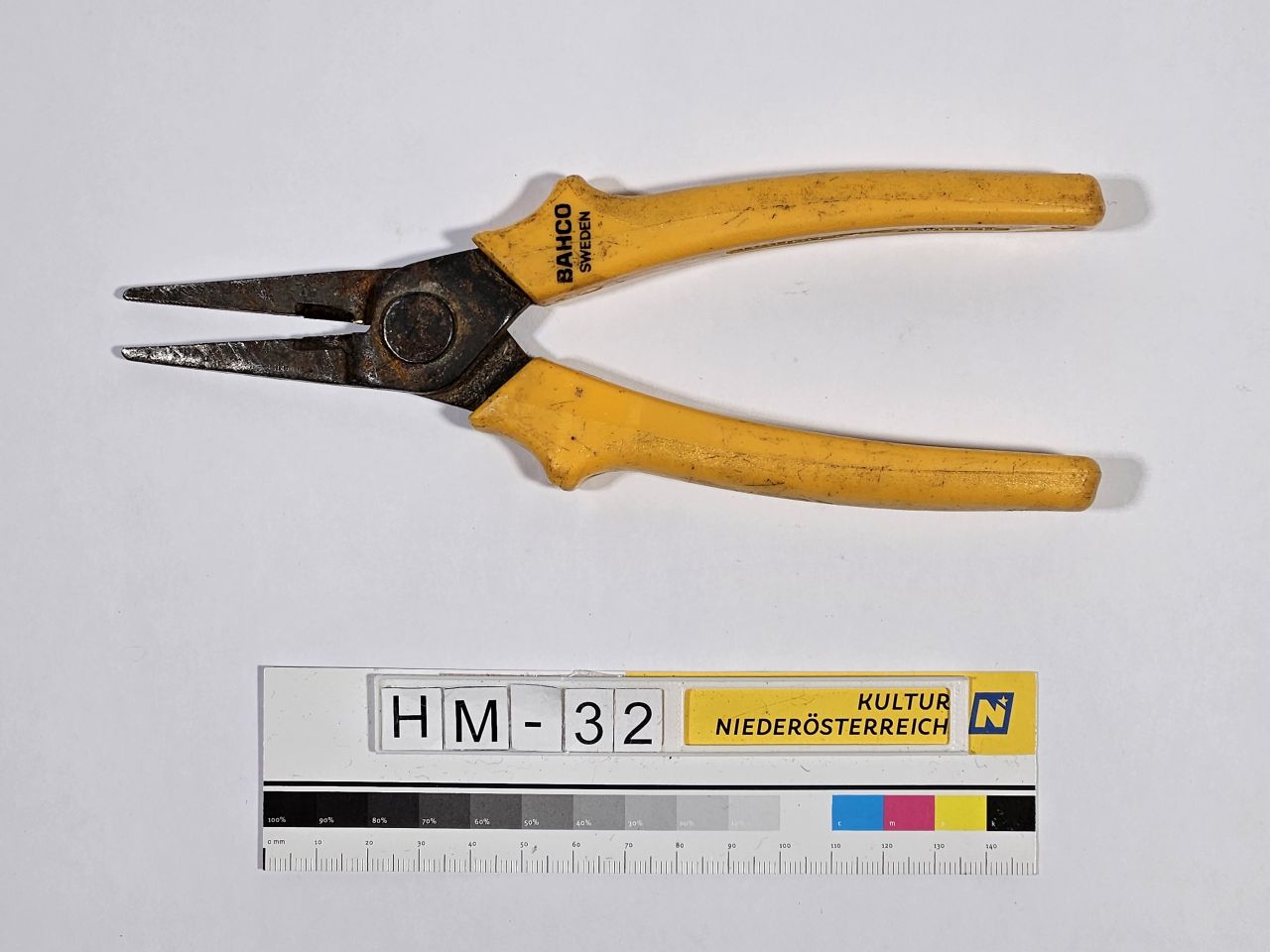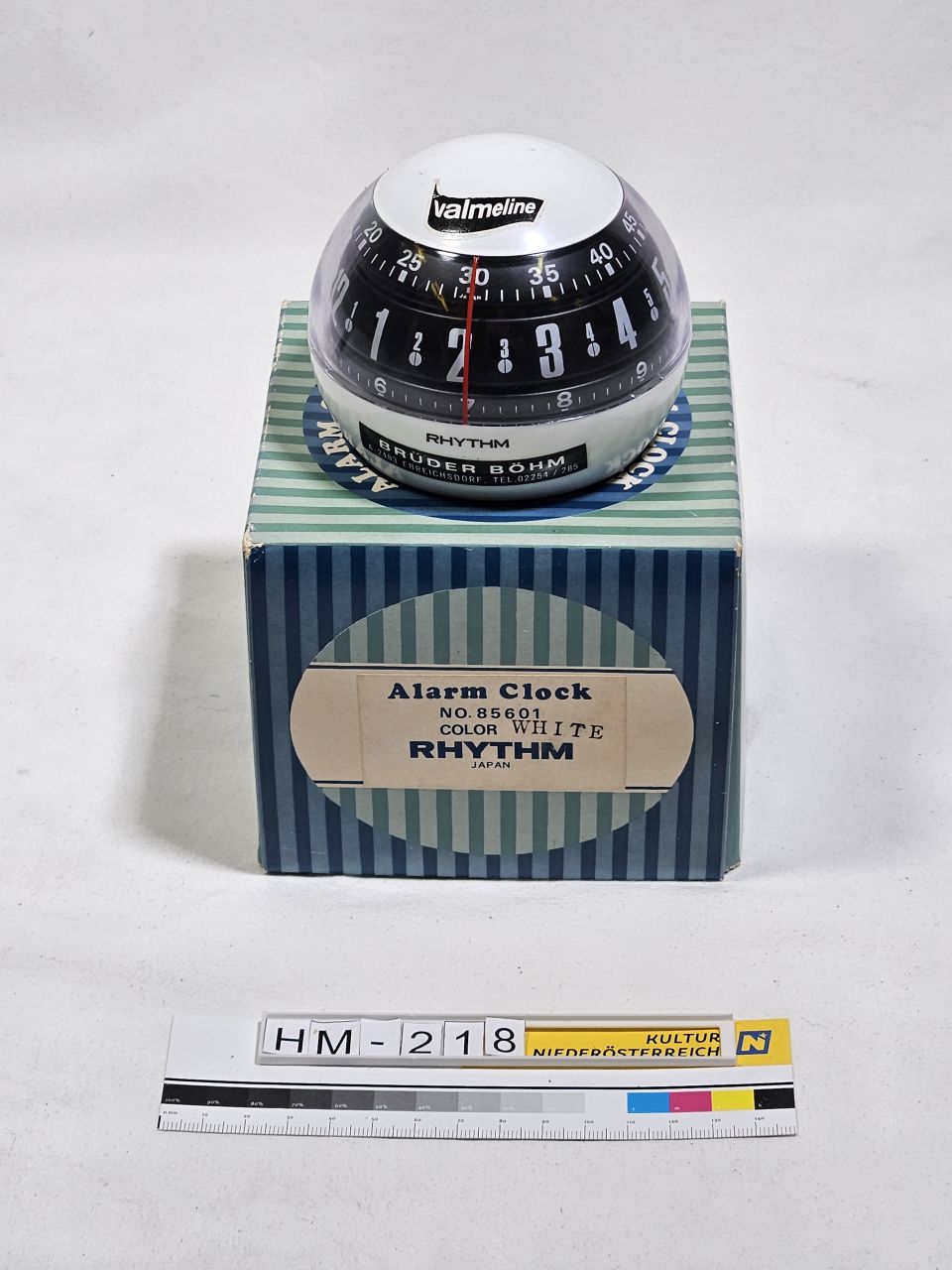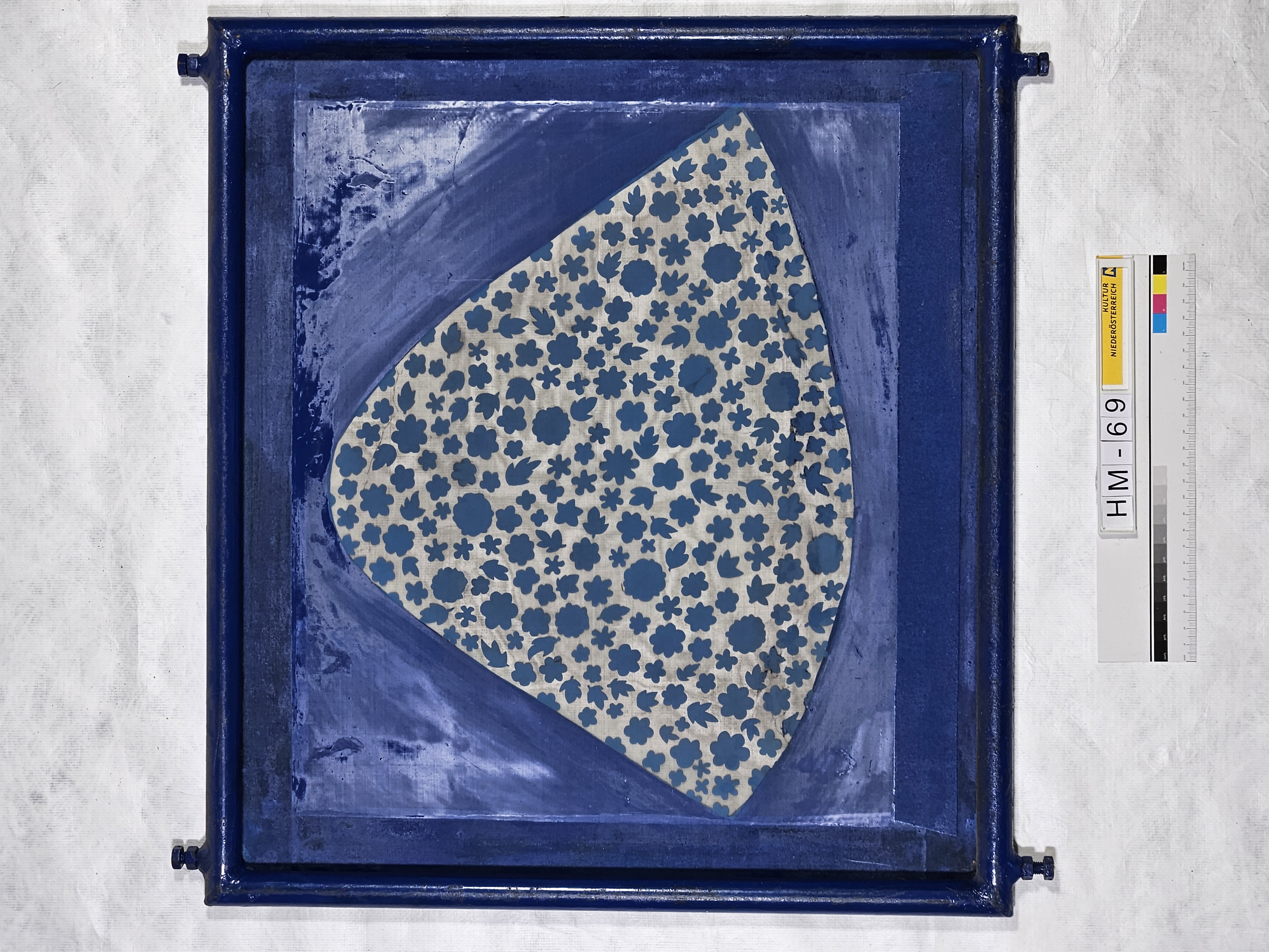 blau gefärbter Metallrahmen mit blauem Kunststoffhintergrund, mittig Stumpen-Form mit Blatt- und Blütenmuster