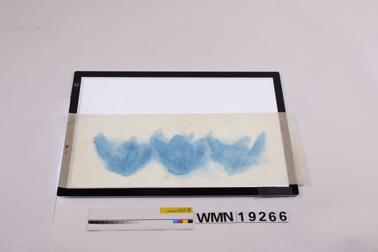 rechteckig; stilisiert florales Motiv (Blüten-, Blattwerk) als 3 Bögen perforierte Motivlinien, durch die blaue Farbe auf den Stoff übertragen wurde; Farbreste
