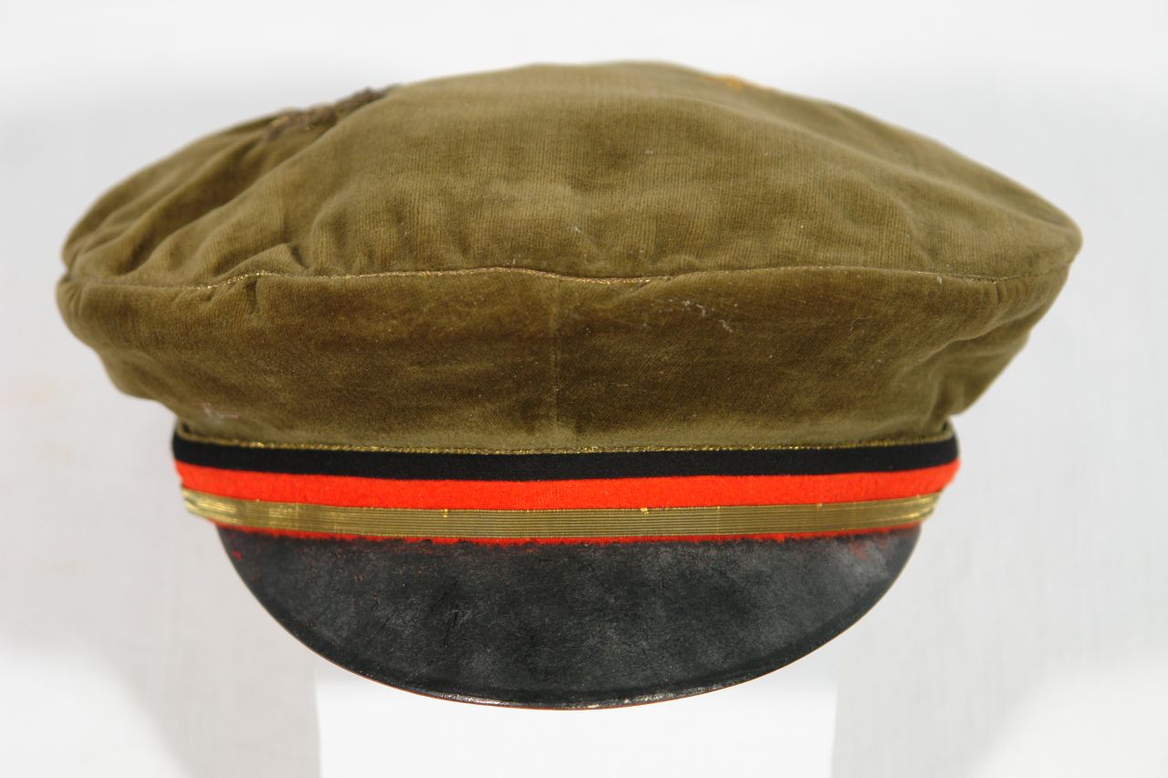 Studentenmütze. Textilien. Grüner Samt mir Goldrand, Mützensteg in schwarz, rot und gold. Schwarzer Schirm. Innen blau. Durchstichlöcher, mit Zirkel, Blume und Eichenlaub übernäht. Dm: 25cm.