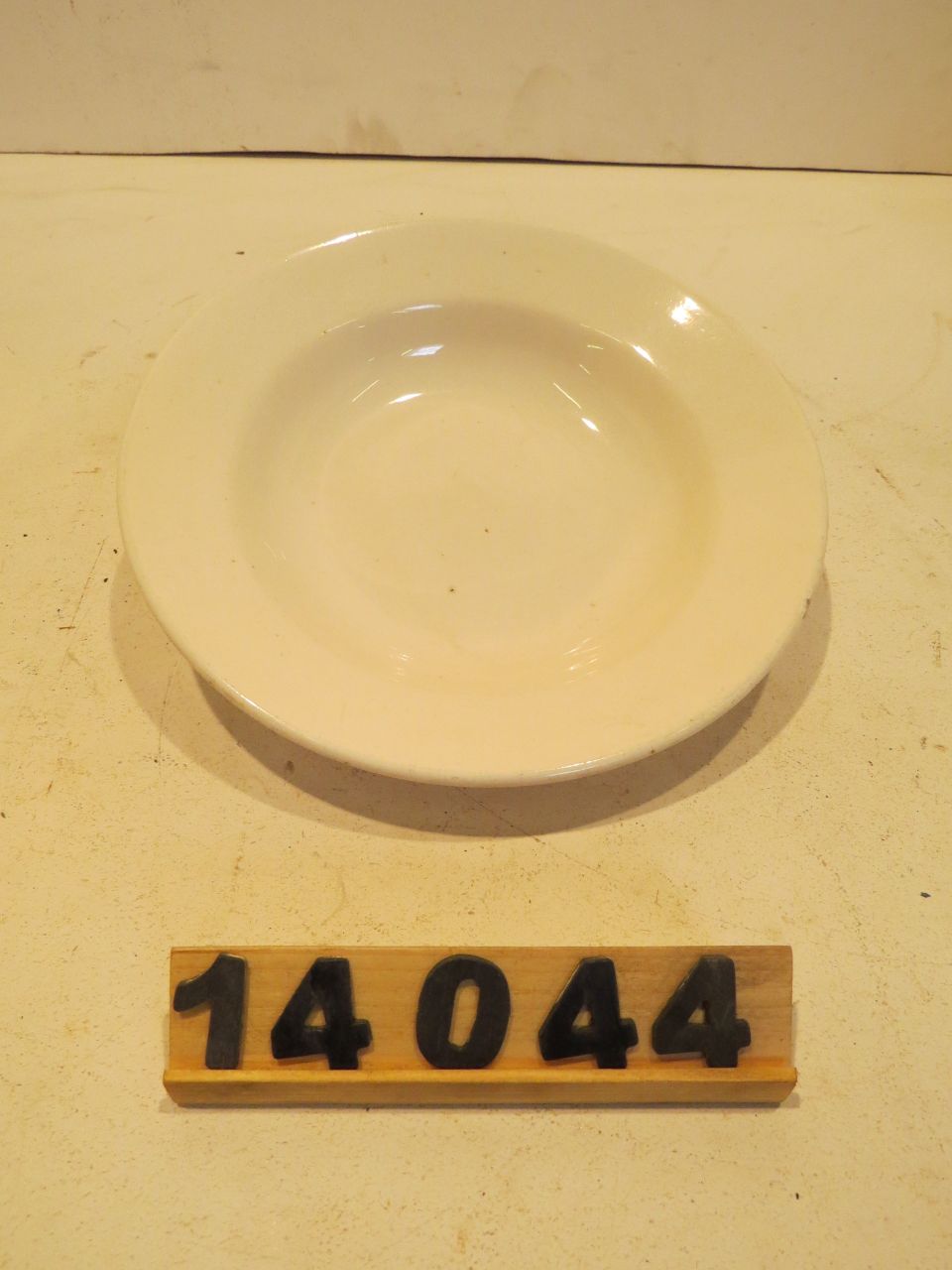 weißer Suppenteller, ev. Steingut glasiert, Unterseite nicht erkennbare, abgetragener Stempel.
