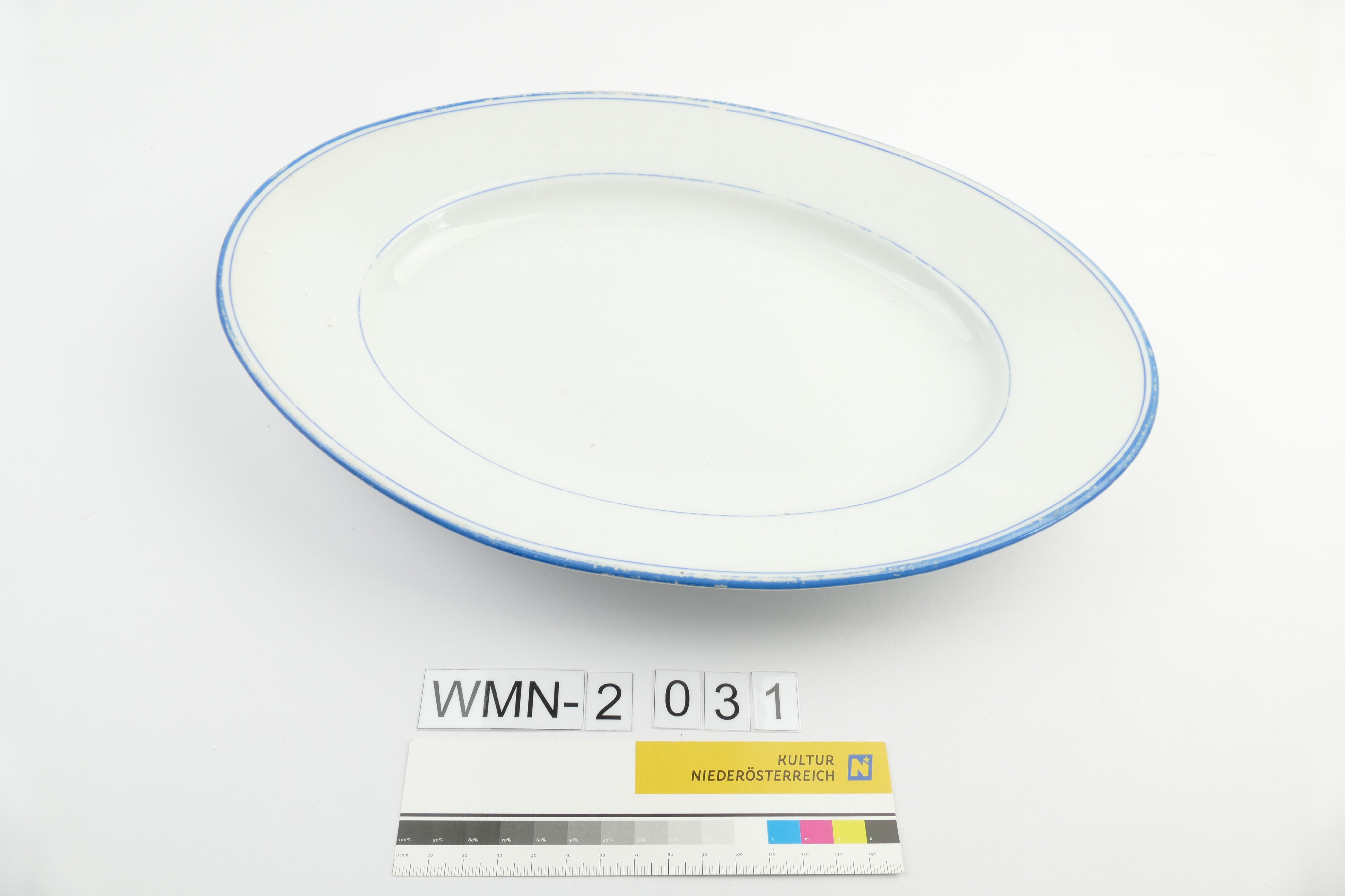 Servierteller; weiß und oval; an Fahne 3 umlaufende blaue Linien und dazwischen eine goldfarbene Linie; ovaler Steg am Boden, sowie Pressstempel "ROB. PERSCH MILDENEICHEN", "4"