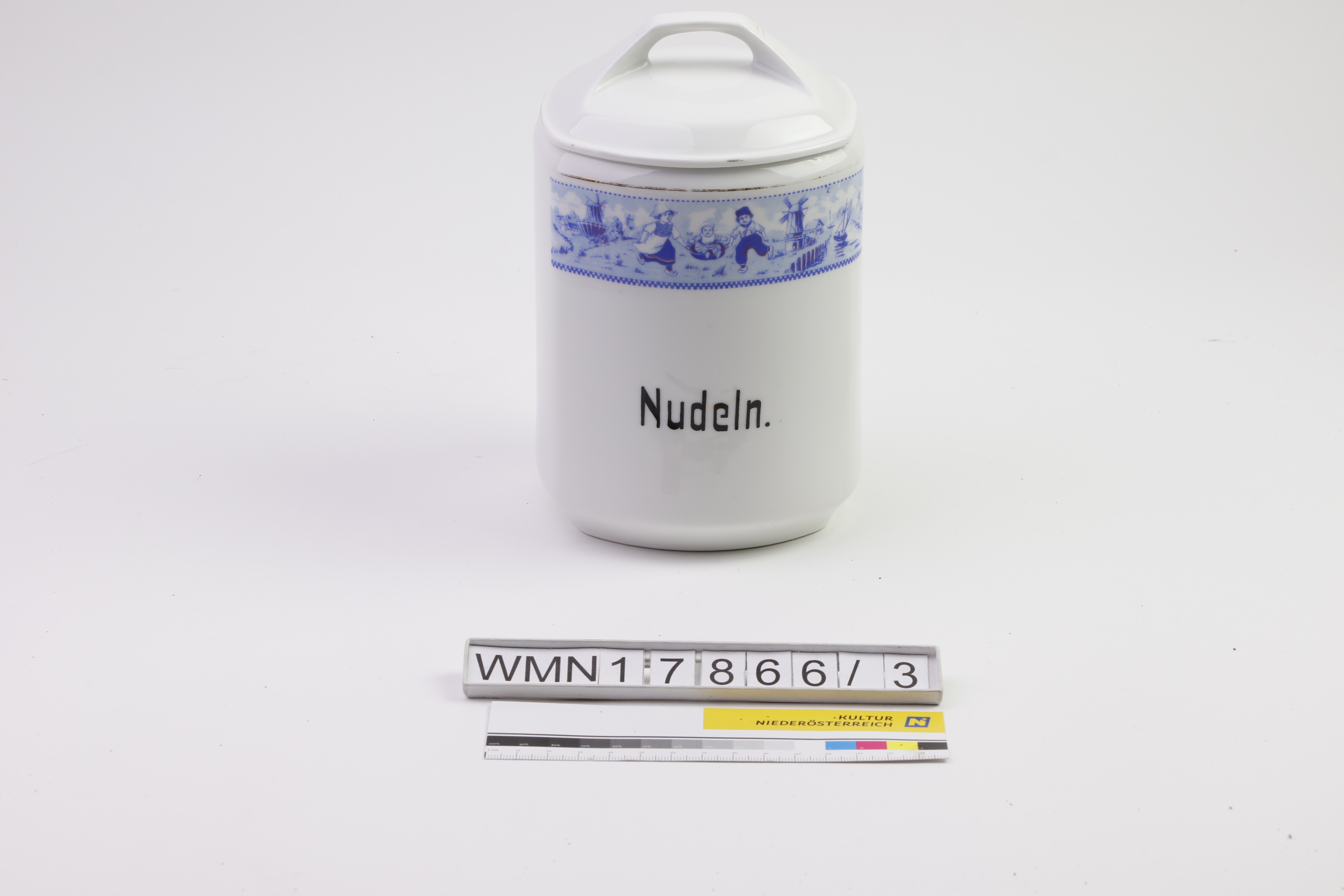 Vorratsdose eines Sets (a) mit Deckel (b); Behälter (a) außen/innen: weiß (glasiert), annähernd rechteckiger Behälter; an der vorderen Wandung ist eine goldfarbene Zierlinie und ein blauer Dekorstreifen mit Darstellung eines niederländischen Motives (Mutter, Vater, Kind und Windmühlen); darunter ist die schwarze Aufschrift "Nudeln."; eine grüne Bodenmarke "Aich CZECHOSLOVAKIA" und ein Pressstempel "10492"; Deckel (b) mit Griff und am Rand eine umlaufende goldfarbene Zierlinie sowie am Griff li und re je 2 umlaufende goldfarbene Zierlinien