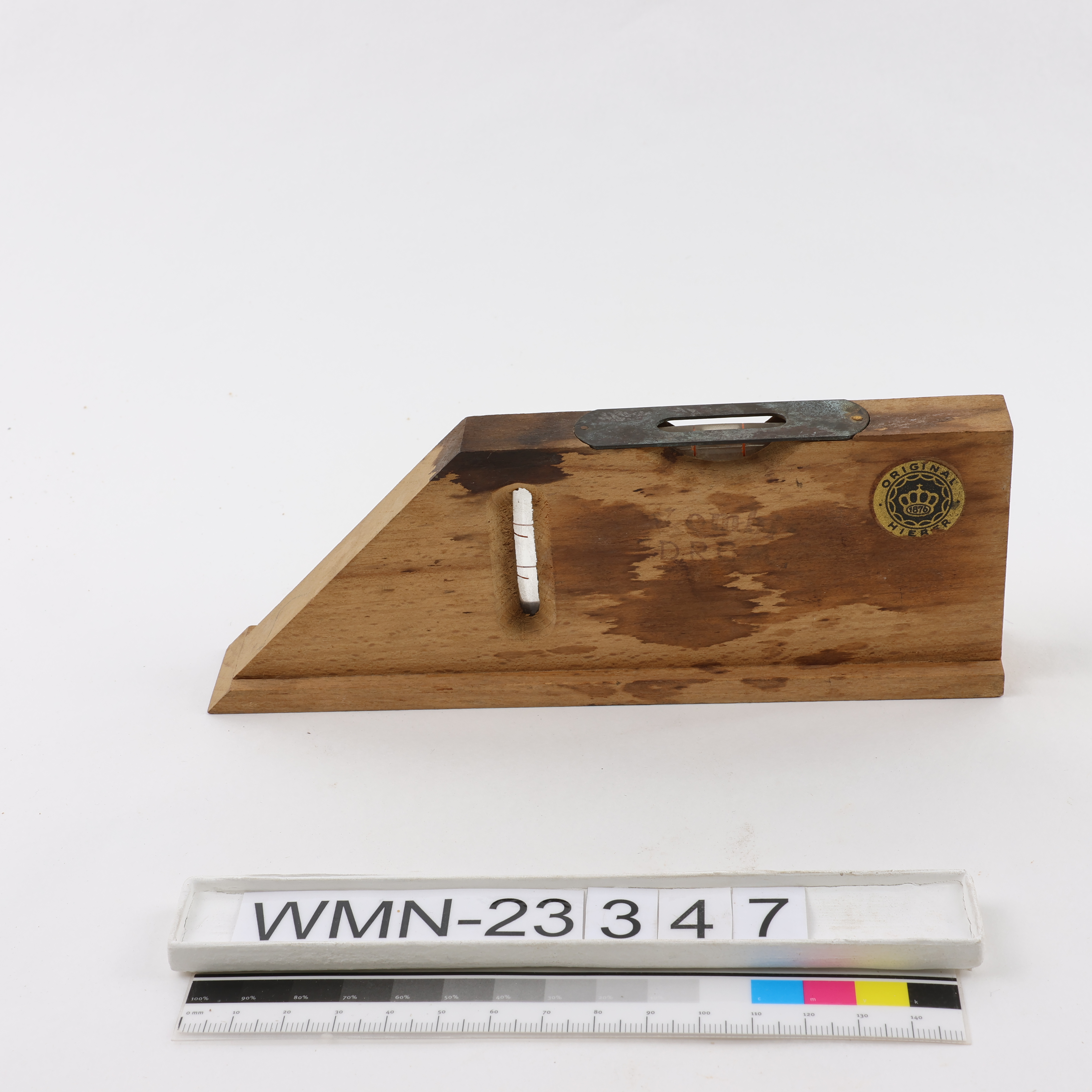 Anschlagswasserwaage mit Neigungswinkel; kleine Wasserwaage (naturbelassen) mit 1 Horizontal- und 1 Vertikallibelle, von beiden Seiten sichtbar; rechteckiges Holzgehäuse mit einer zugespitzten Seite für einen Eckwinkel; an der Ober- und Unterseite ausgefräst; je 1 eingesetzte Libelle mit je 2 orangenen Richtmarkierungen (Pars); darüber einerseits eine metallenen Schutzdeckplatte, und andererseits eine überrandständige Anschlagsleiste; Aufschriften: 1.) gestempelt "Kombi-[unl.]"; 2.) aufgeklebtes Herstellerlogo in einem goldenen Kreis mit schwarzem Dekor, im Zentrum eine Krone mit der Jahreszahl "1876", darüber im Kreis geschrieben "ORIGINAL HIEBER" (Heinrich Hieber, deutsche Holzwerkzeugfabrik)