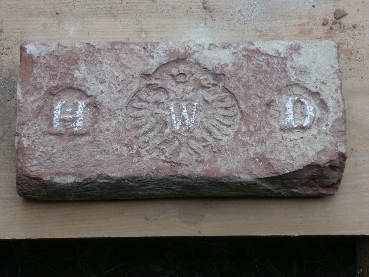 Mauerziegel; ziegelrot; Ziegelzeichen "H Wappen D"; zwischen den Initialen HD (Heinrich Drasche) ein gekrönter Doppelkopfadler mit einem W (Wienerberg) im Zentrum