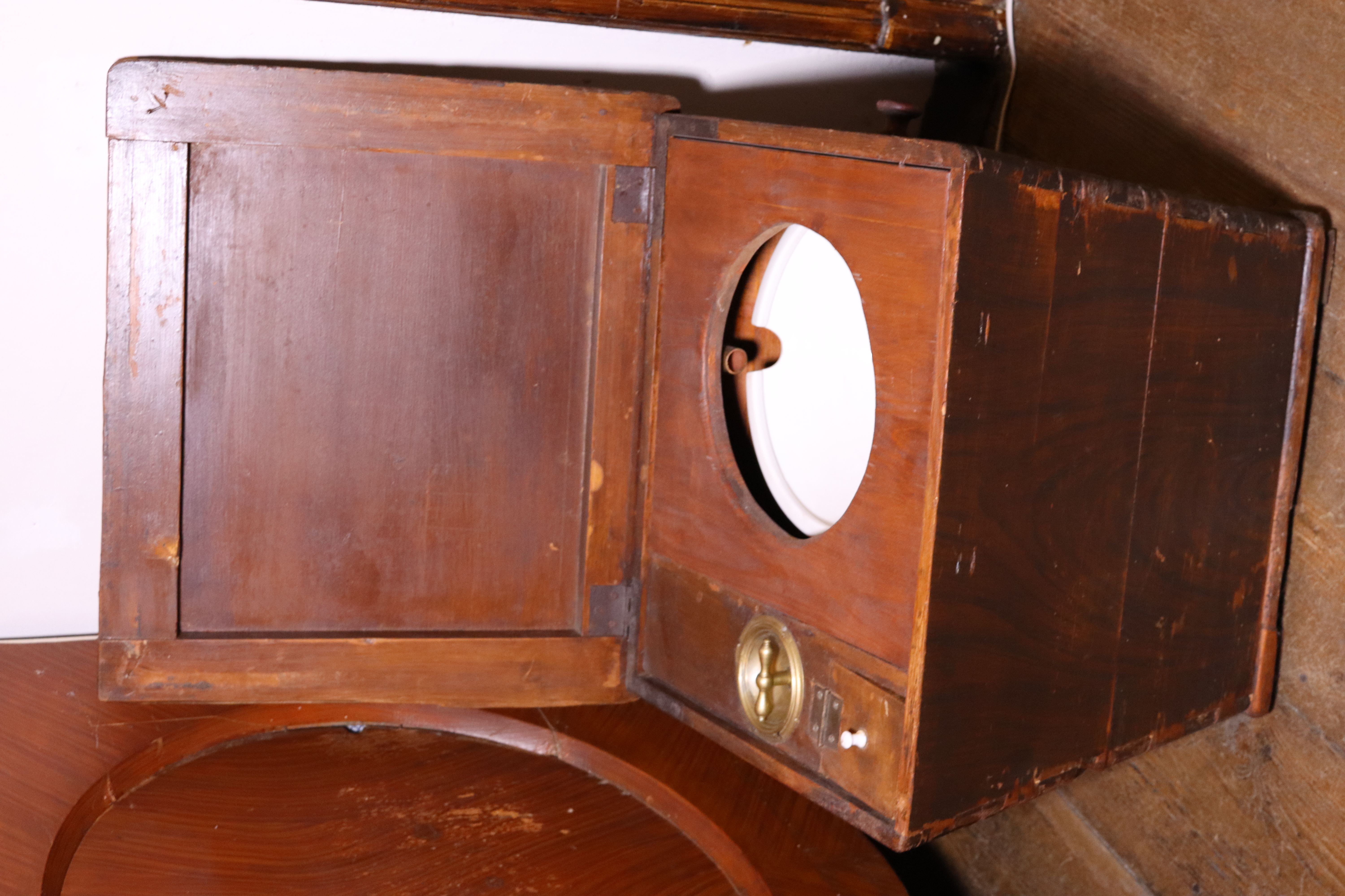 Zimmerklosett/Leibstuhl aus Holz mit Wasserspülung; weiße Keramikschüssel
